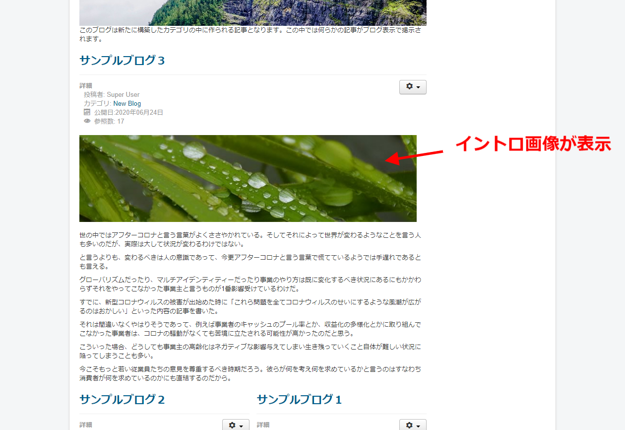 ここではNew Blog カテゴリの記事がブログ表示されています。(カテゴリブログ表示)そこでこの中のサンプルブログ3の記事に「イントロ画像」と「記事全体の画像」を設定をします。