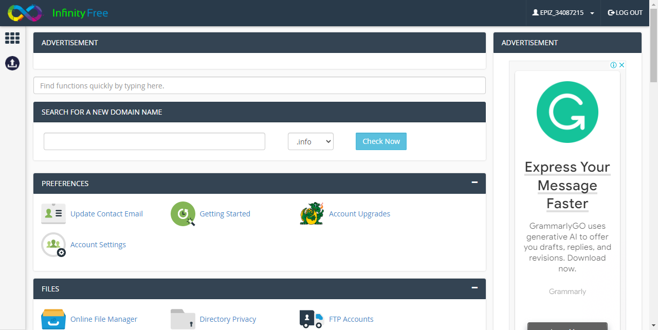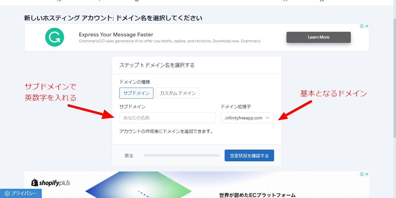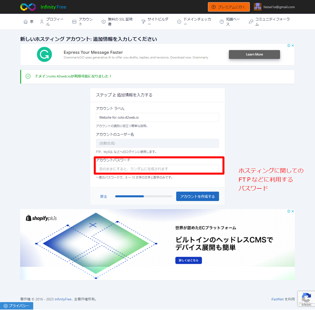 Infinityfreeの場合、沢山のホスティング(ホームページ)が作れるため、それぞれにアカウントが存在します。このためユーザ設定ができた後、このホスティングアカウントを追加する必要があります。