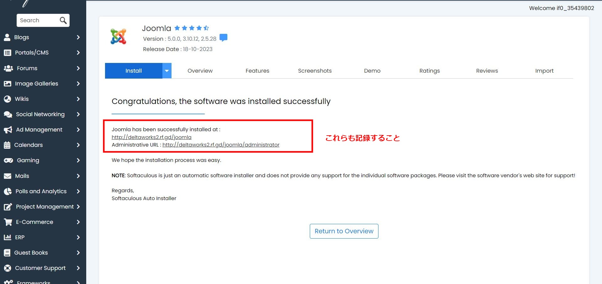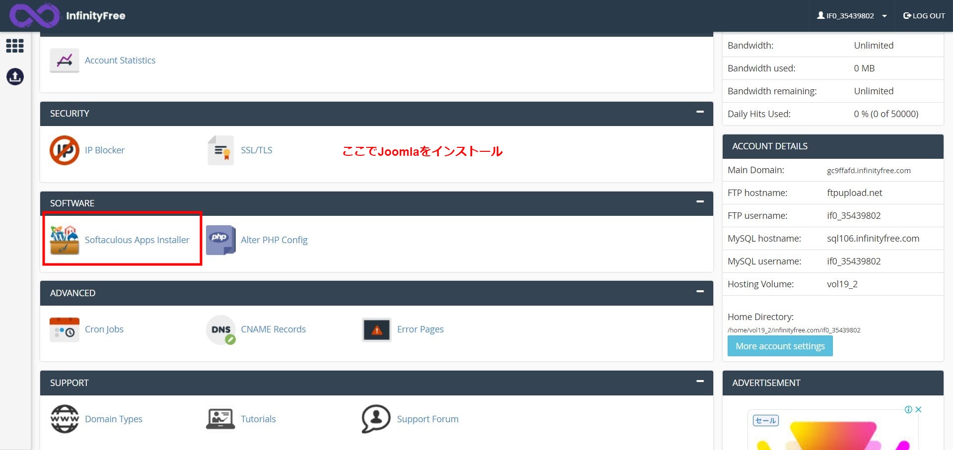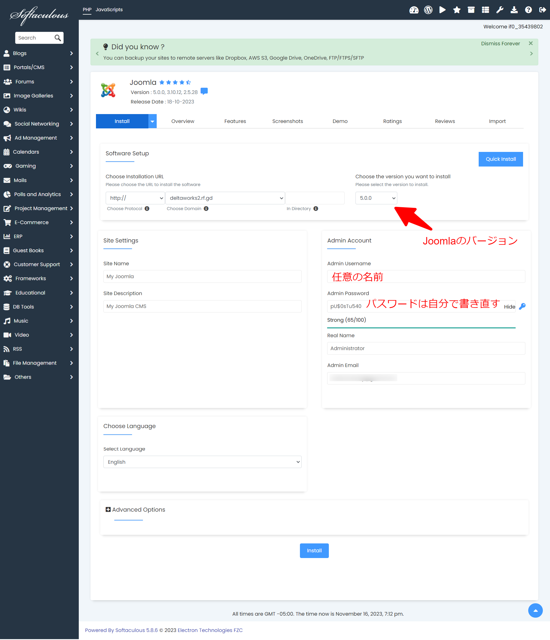 ソフトウェアーインストールのボタンでJoomaのインストールを選び各種情報を記入してからインストールボタンでインストールを行ってください。