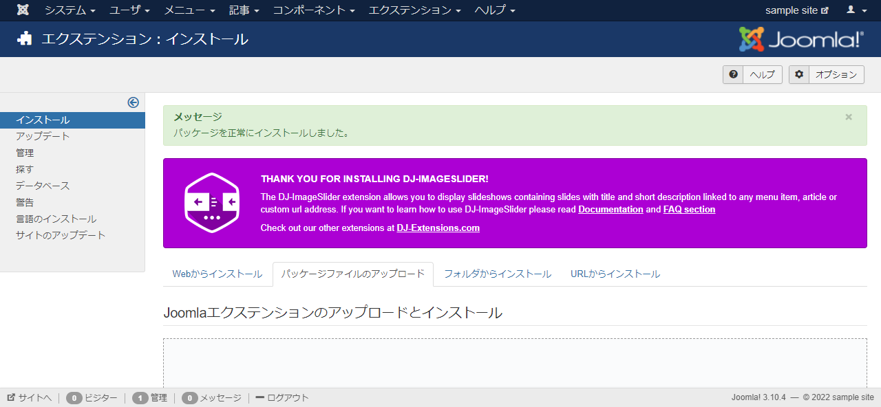 今日時点のファイルは「pkg_dj-imageslider-AIO_4.3」というZIPファイルでしたのでそれを通常の形でインストールします。