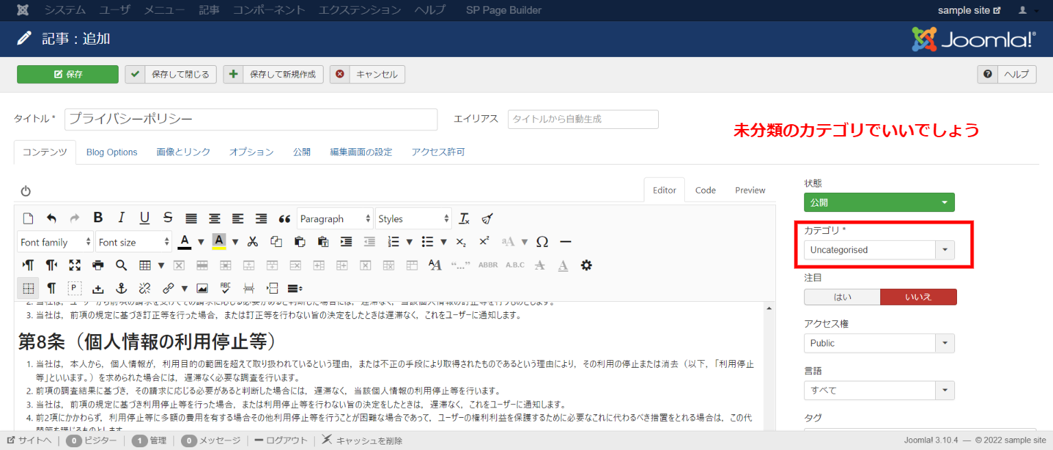 新規記事で作りますがこの場合、カテゴリは未分類にしたほうがいいでしょう。