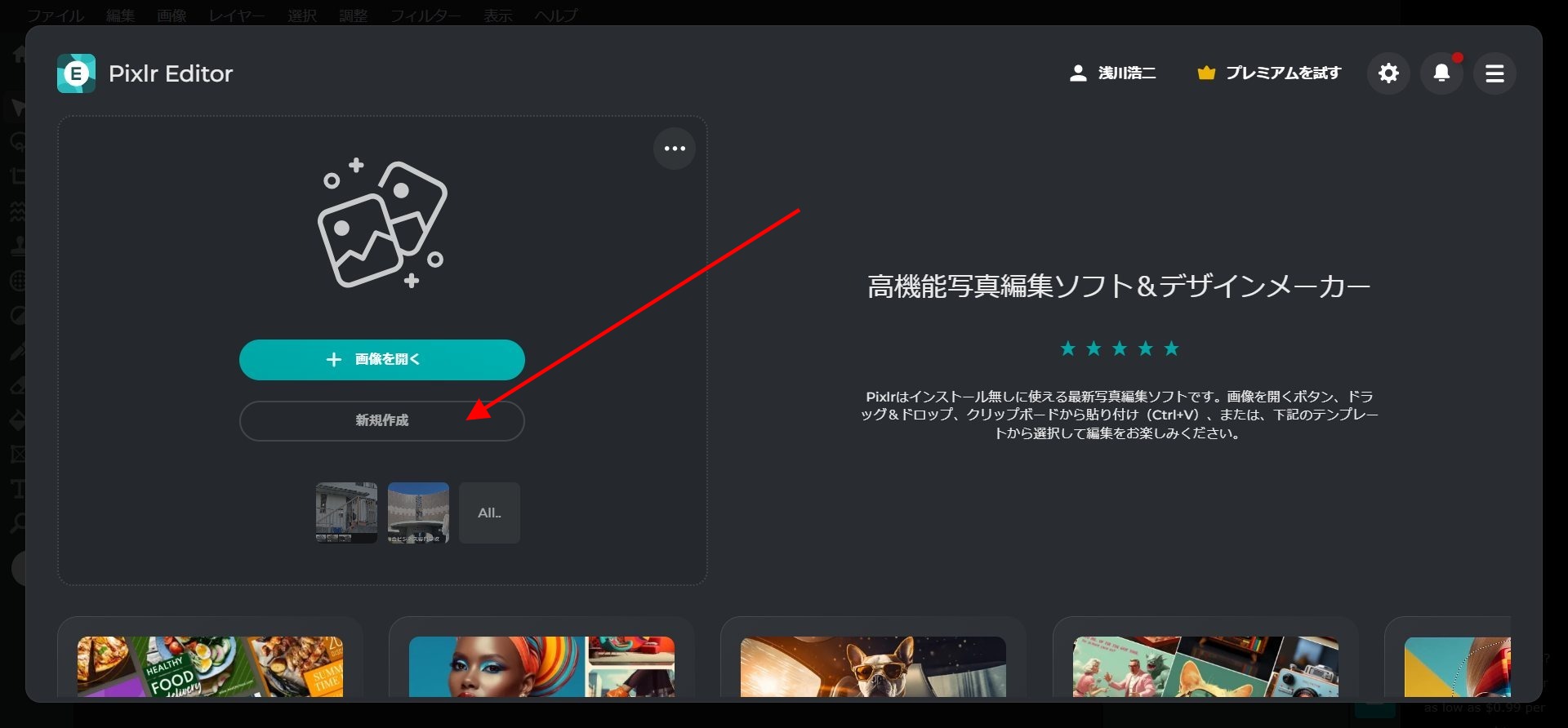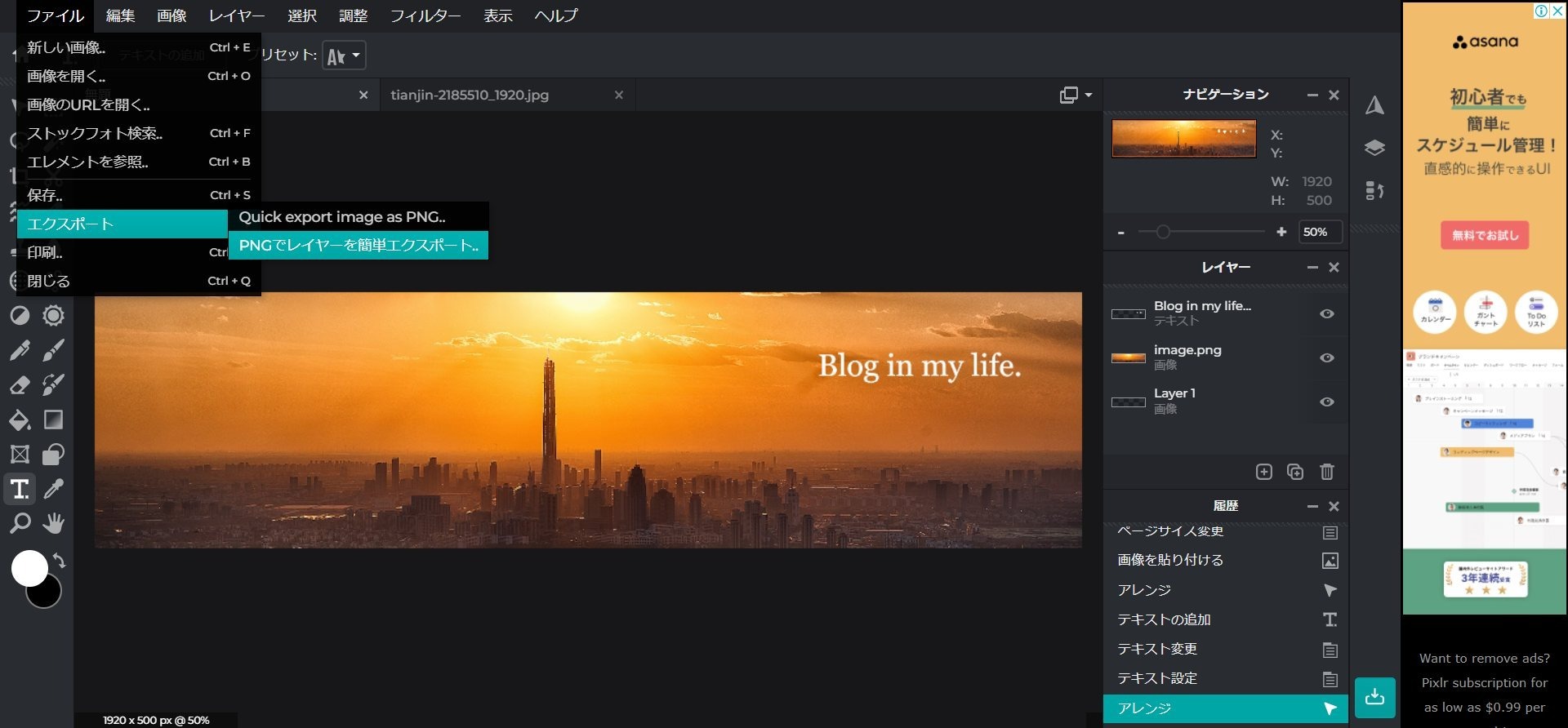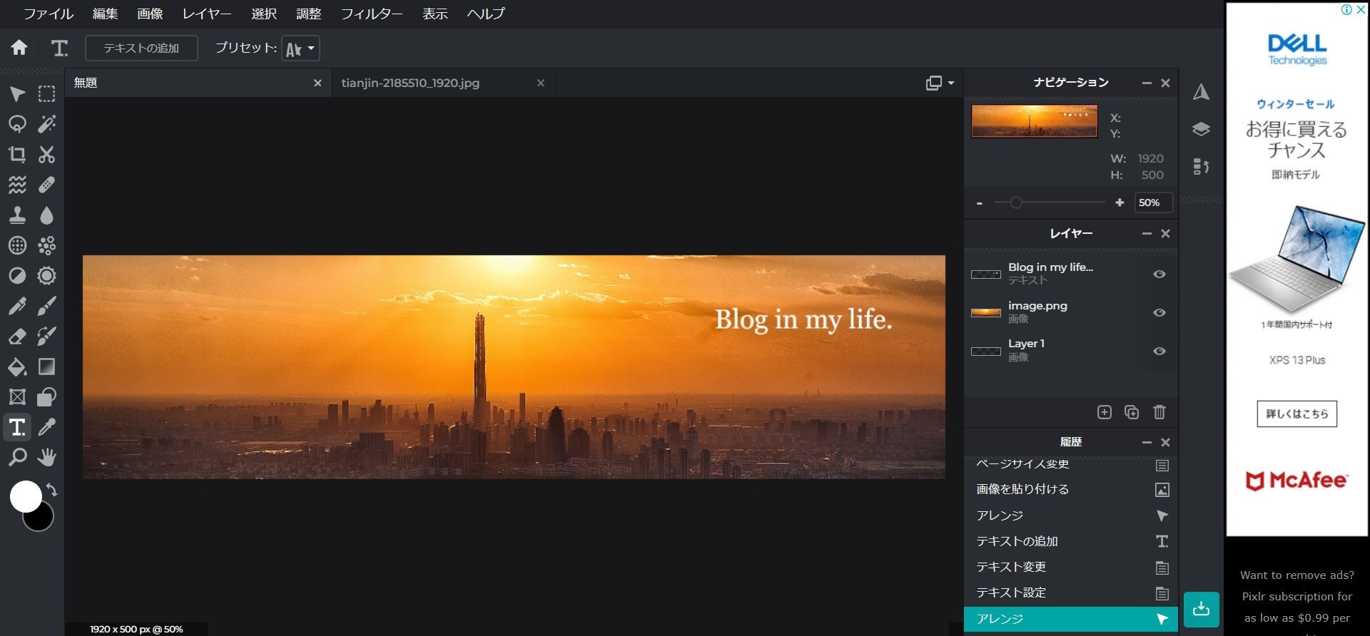 まずはグラフィックエディタで画像を作りましょう。今回使うのはPixlrEというウェブエディタです。サイズは1920:500にしました