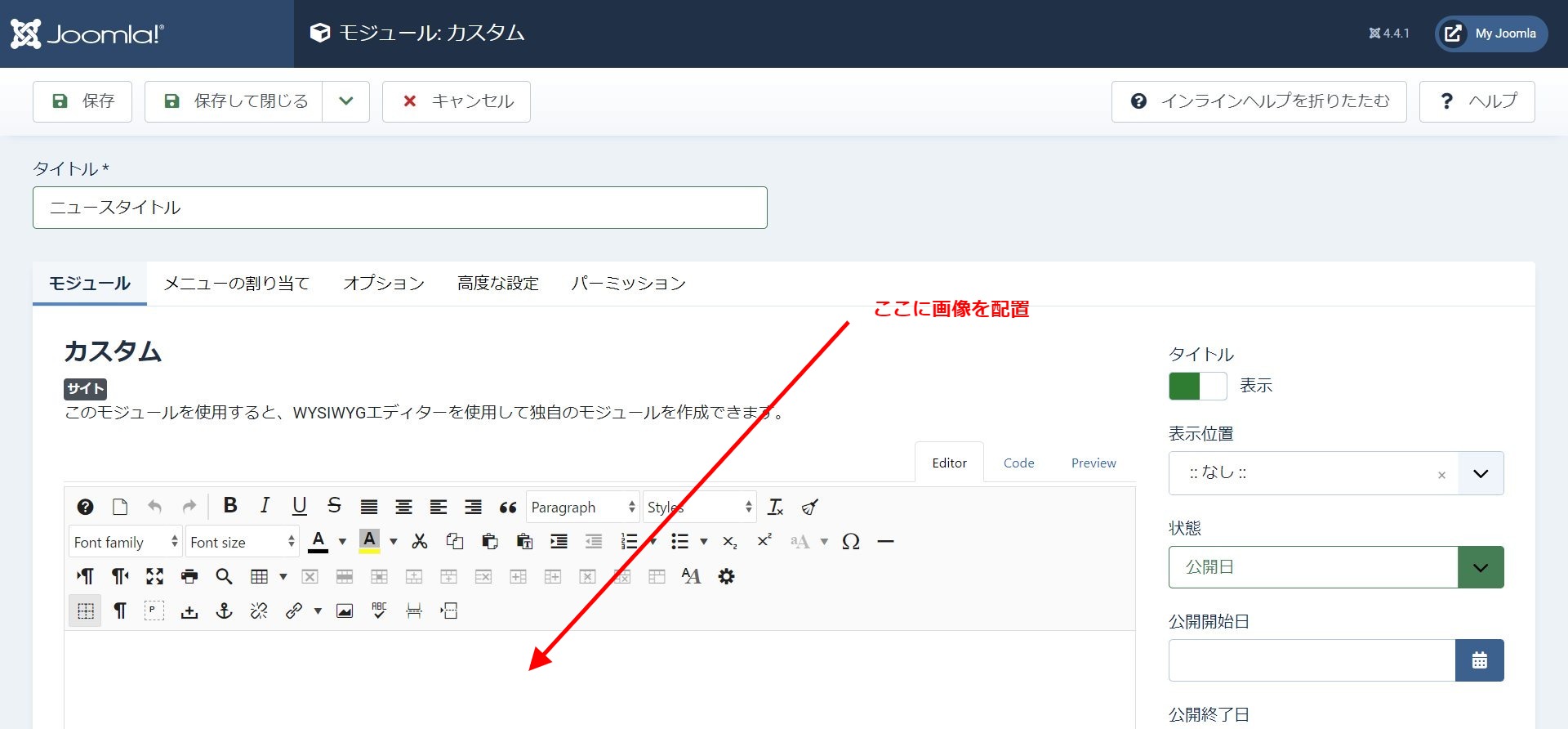 Joomla」におけるモジュールとはページにおける部品のうようなものです。これらはモジュールポジションよ呼ばれる配置できるエリアがあり、今回は title ポジションに画像モジュールを配置します。作ったモジュールはこの配置のためのポジションの設定と、メニューにおいてどのメニューに対して有効なのかを指定することで配置できます。