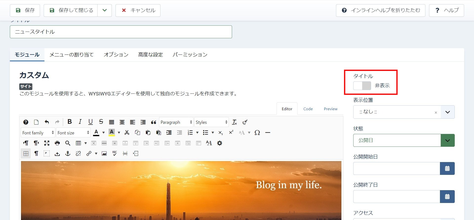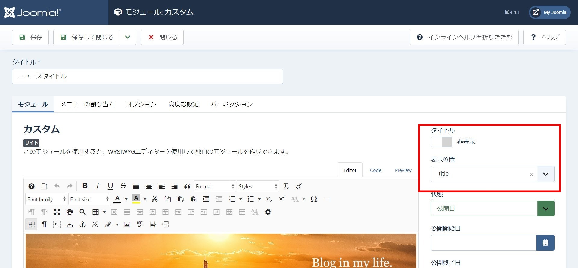今回はタイトル画像のみのHTMLモジュールを作ることになります。表示するタイトルの文字は不要なので非表示にします。モジュールポジションは titleです