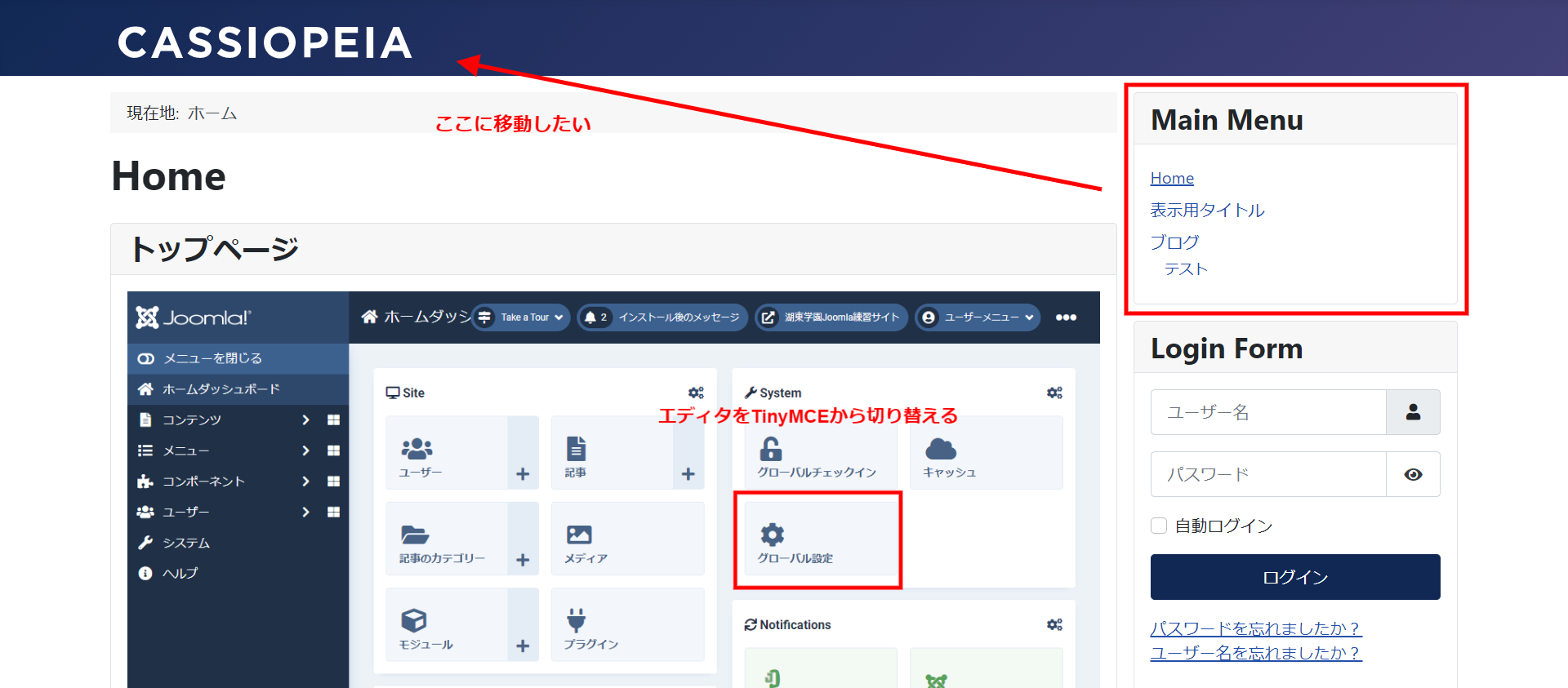 Joomlaの場合Wordpressなどと違い記事を書いたからすぐに表示されるという仕組みではありません。そこで、書いた記事を固定ページとして表示させる手順を説明します。