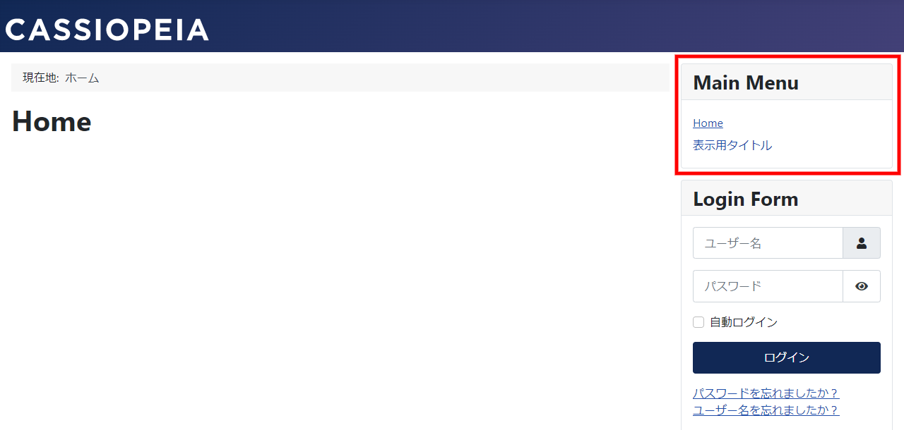 デフォルトの表示ではサイト右側に Main Menu というモジュールがありそこに Home というメニューが表示されて言います。初期段階ではメニューはそれ一つです。