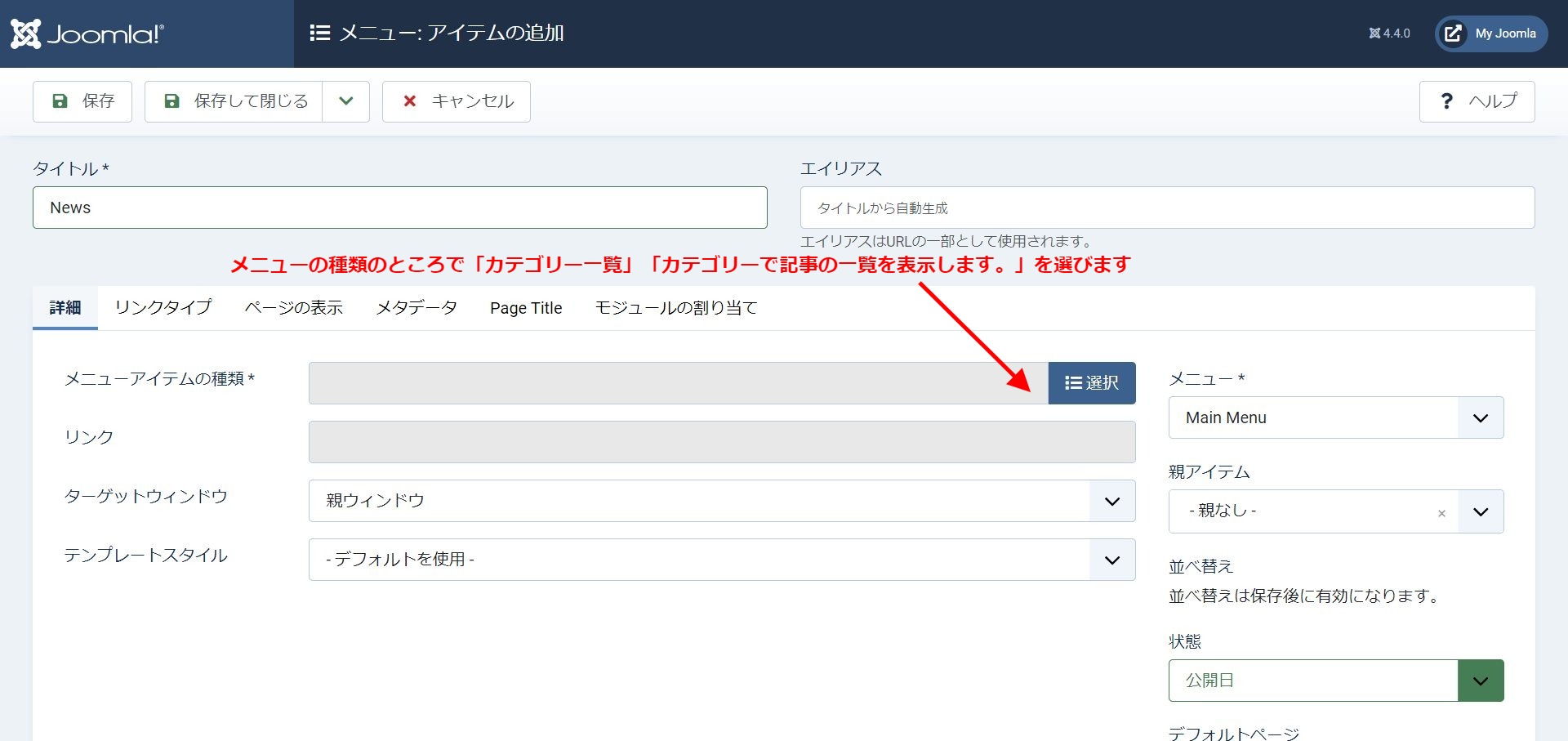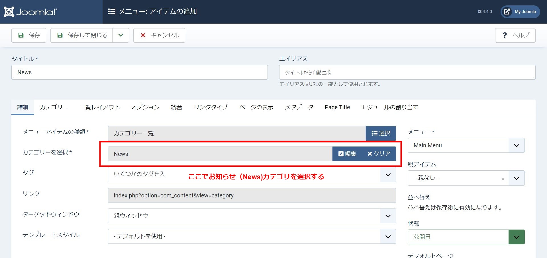 一覧を選択するとカテゴリの選択が表示されるので、おしらせ(News)を選択して保存する