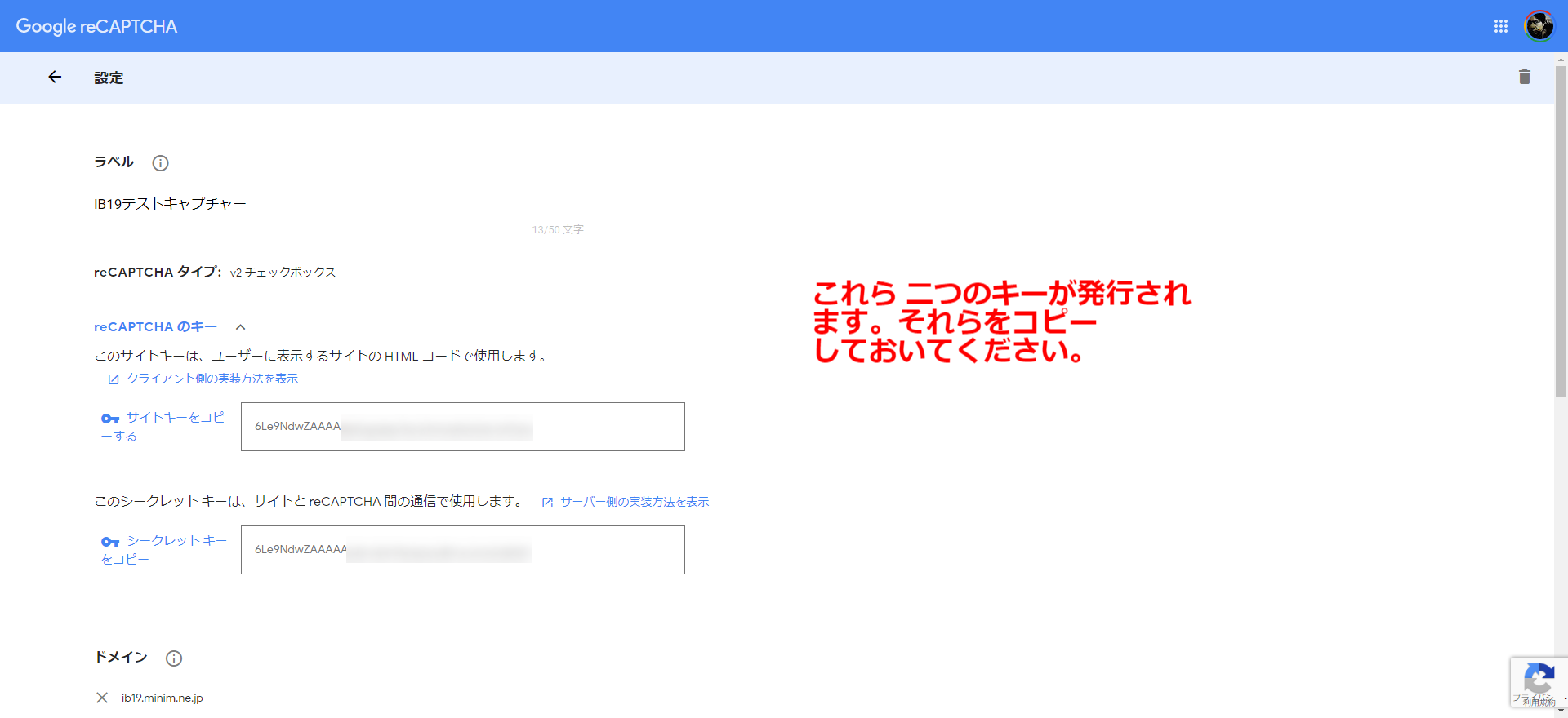 このためにまずはGoogleで公開キーと秘密キーを発行してください。