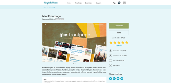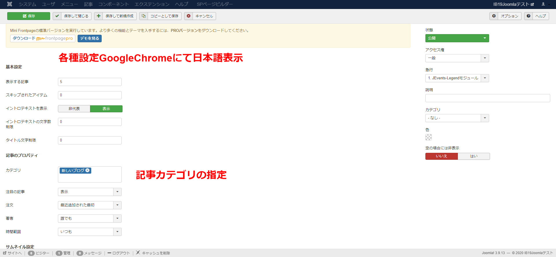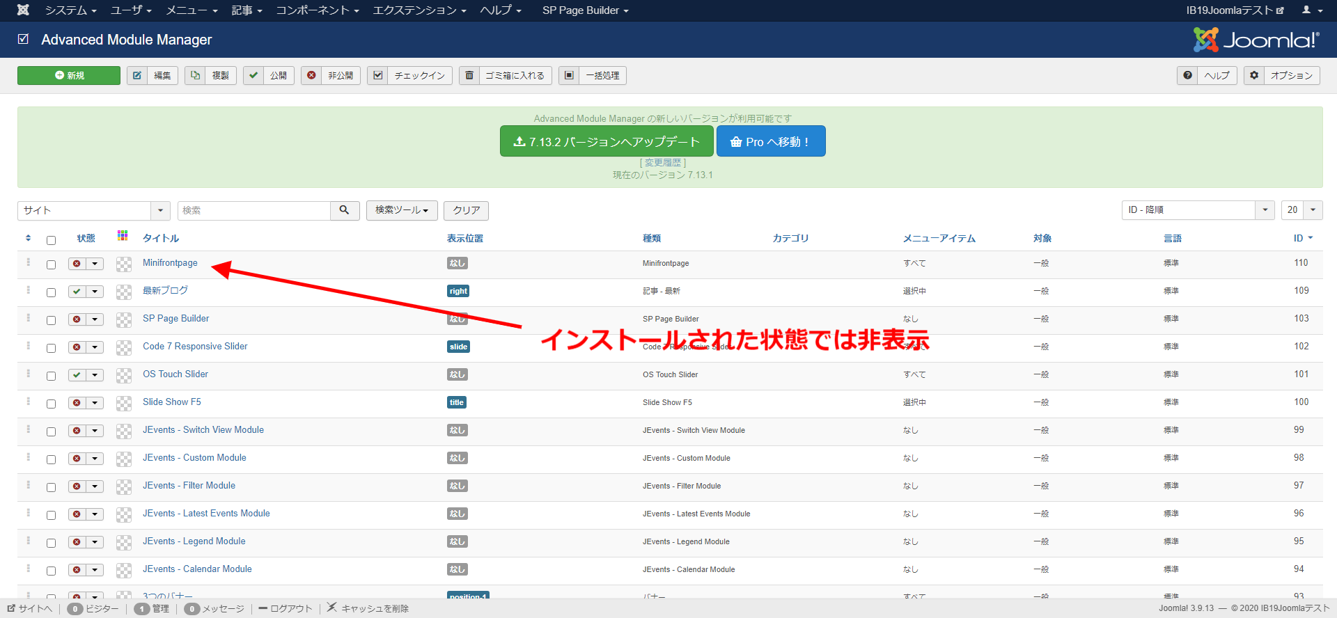先のダウンロードされたファイルにはJoomla3及び4用の2つのファイルが含まれているため、まずいったん解凍して mod_minifrontpage_J3 を選びイオンストールします。デフォルトでは非表示になっています。