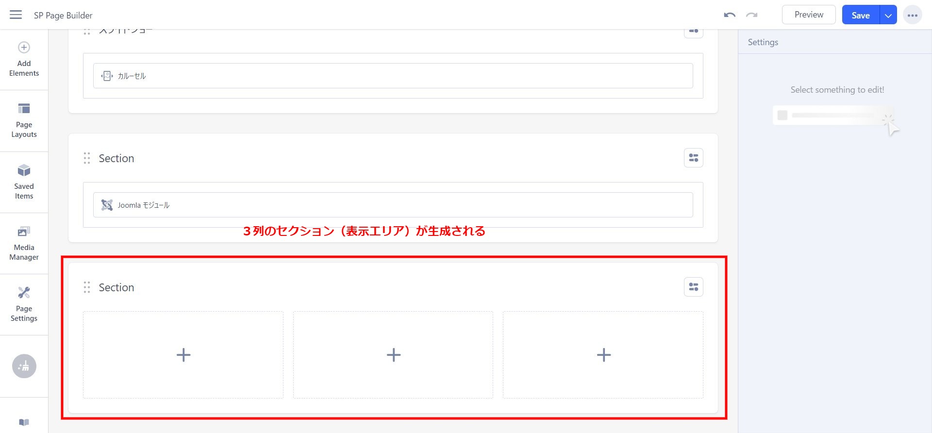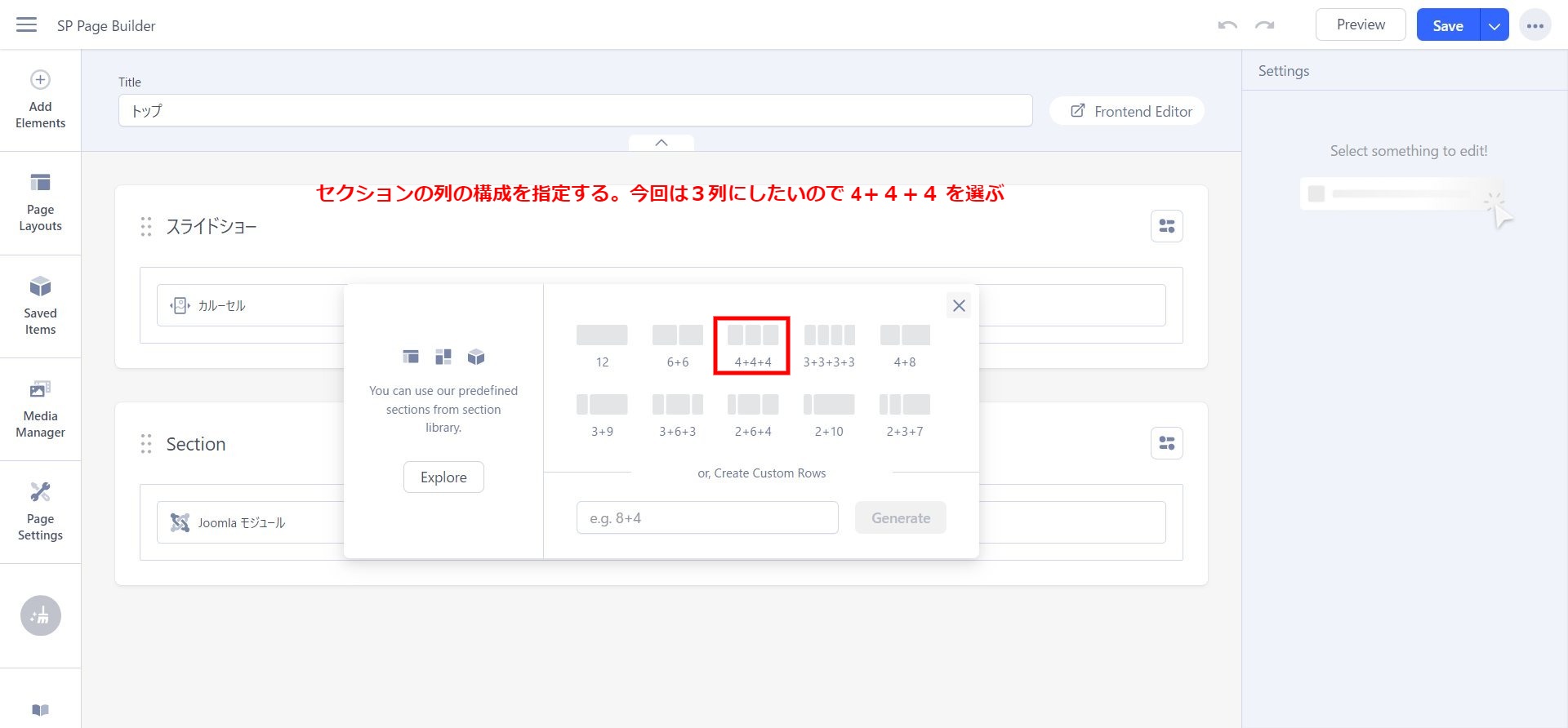 ページ内においてはセクションよ呼ばれる行の追加が必要になりますのでまずは中身の入っていないセクションを追加してください。この場合Bootstrapにおける12分割が基本となるので手動でも変更可能です。今回は3列のエリアを作りたいのでそれを指定します。