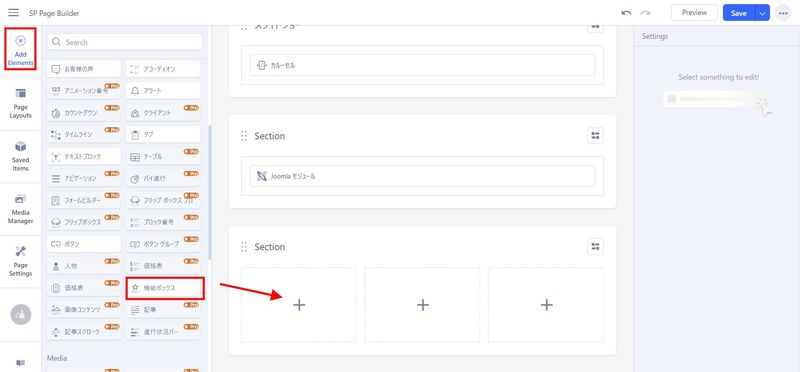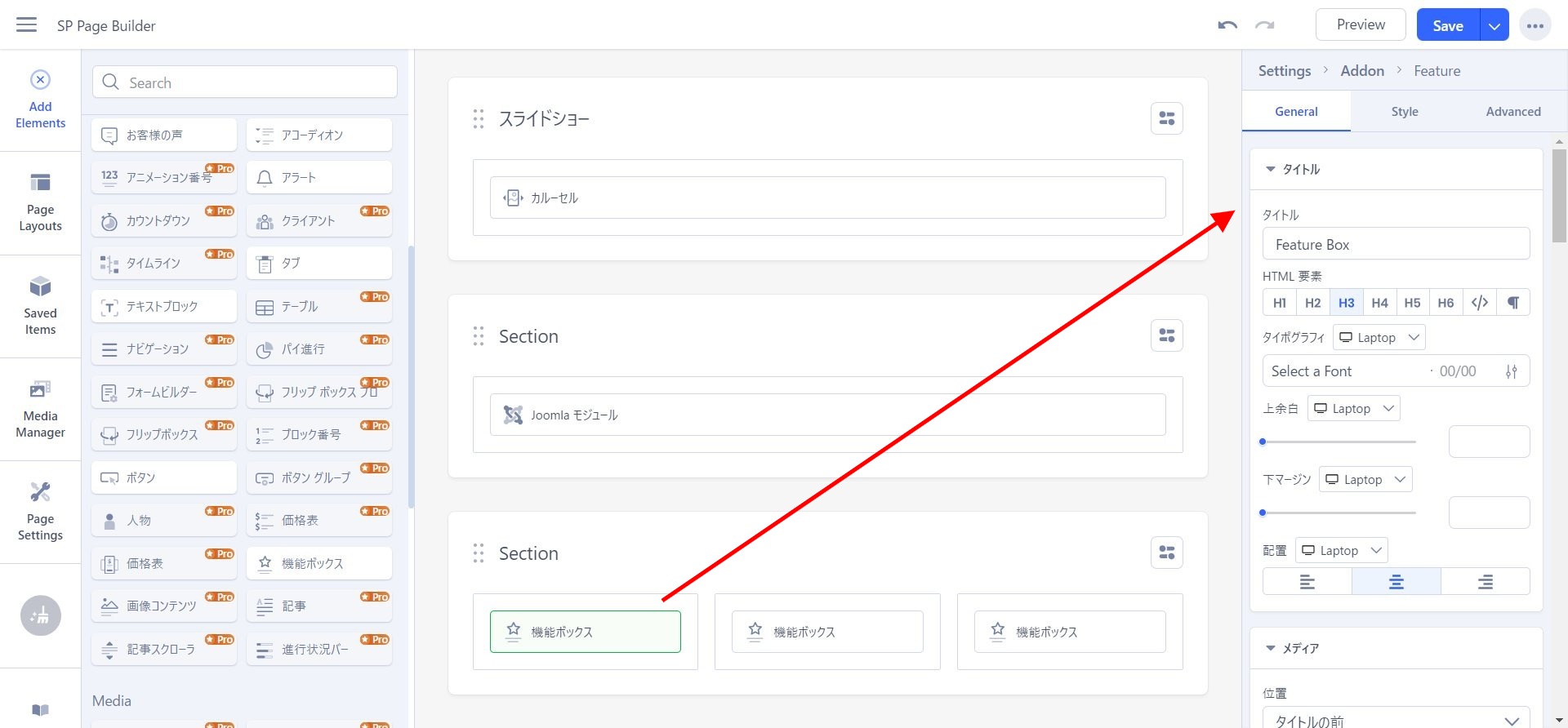 SP page Builder で作ったページ内に Feature Box というアドオンを埋め込む手順について説明します。