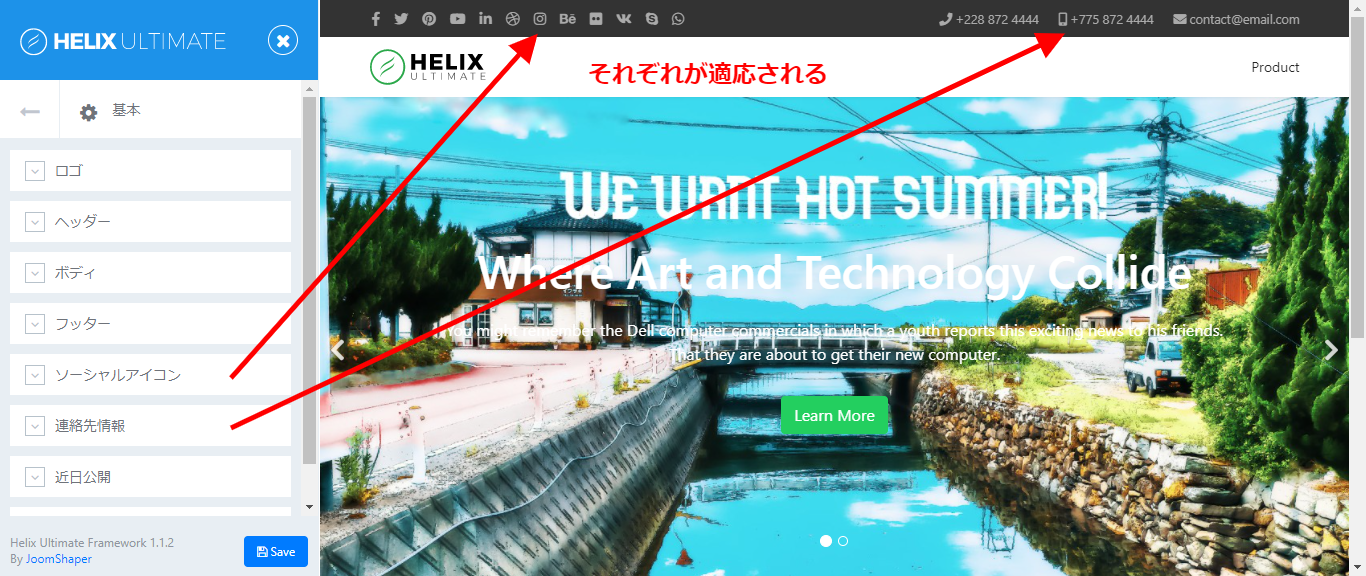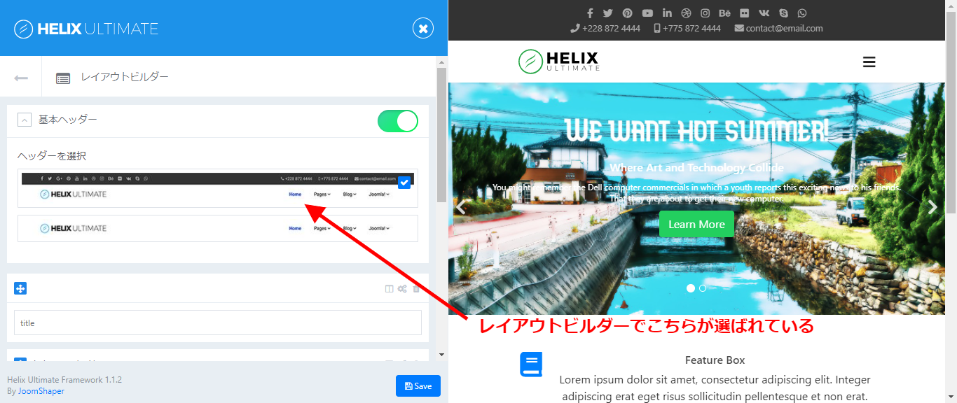 基本ヘッダーのところで上部の表示があらばれているのを確認します。