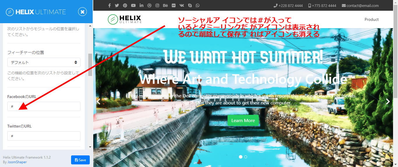 続いて基本へ移動しソーシャルアイコンで必要なもののURLを入力、不要なものの#を削除して保存します。